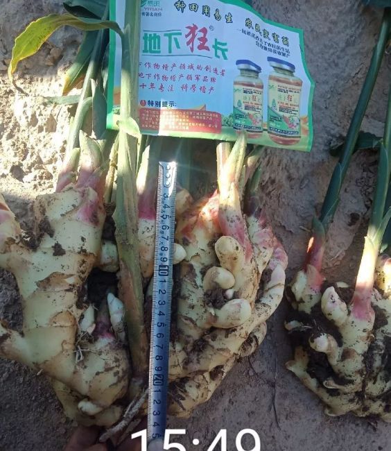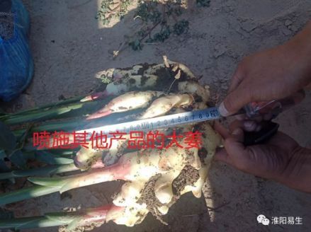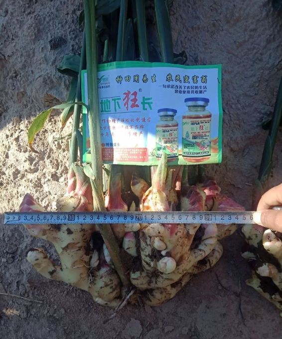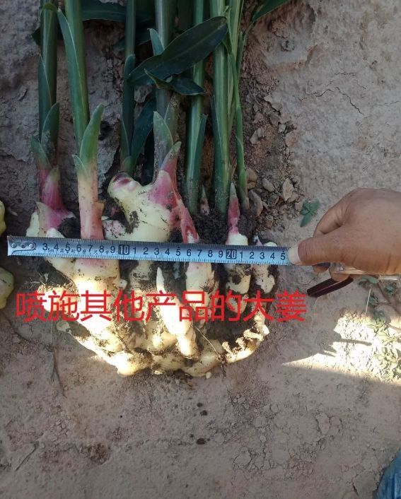 我們的市場(chǎng)人員現場(chǎng)挖姜,將噴施地下狂長(cháng)的大姜與噴施其他產(chǎn)品的大姜現場(chǎng)測量對比,噴施過(guò)地下狂長(cháng)的大姜姜指頭粗胖、連接點(diǎn)粗,不易破盤(pán),姜盤(pán)齊整,并且比噴施其他產(chǎn)品的大姜長(cháng)10cm,高5cm,對比非常明顯。