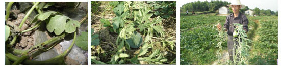 病株被病菌浸染候,在氣候正常情況下,一般能正常生長(cháng)2030天,能正常開(kāi)花結瓜,干旱無(wú)雨,氣溫在30度以上基本能正常生長(cháng),雨后氣溫下降至28度以下,天晴突然死亡,所以瓜農俗稱(chēng)抽秧死。